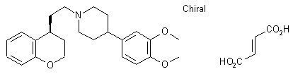 The racemic compound RP 58866 was synthesized as follows: The ethyl ester of (2,3-dihydro-4H-1-benzopyran-4-ylidene)acetic acid (II) is prepared by carrying out the Wittig-Horner reaction on commercially available chromanone (I), followed by catalytic hydrogenation over 10% Pd on carbon to yield the ethyl ester of 3,4-dihydro-2H-1-benzopyran-4-acetic acid (III). Reduction of this ester with lithium aluminum hydride gives the alcohol (IV), which is converted into the corresponding bromide (V) (1, 3) by reaction with N,N'-carbonyldiimidazole and an excess of allyl bromide. Subsequent condensation of (V) with 4-(3,4-dimethoxyphenyl)piperidine (VI) by refluxing in 2-butanone, followed by the addition of (E)-2-butenedioic acid (fumaric acid), yields the salt (RS)-1-[2-(3,4-dihydro-2H-1-benzopyran-4-yl)ethyl]-4-(3,4-dimethoxyphenyl)piperidine (E)-2-butenedioate (1:1) (VII).