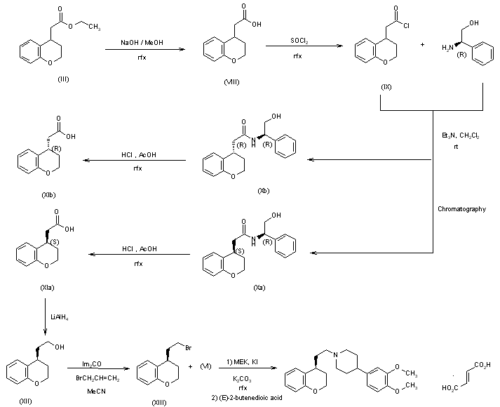Terikalant, the (S)-enantiomer of RP 58866, was synthesized as follows: After hydrolysis of the ethyl ester (III) with NaOH in refluxing methanol, the corresponding acid (VIII) is converted into the acid chloride by refluxing in thionyl chloride. After removal of excess thionyl chloride, the residue is distilled off under reduced pressure to yield the carboxylic acid chloride (IX). Subsequent reaction of (IX) with (R)-(-)-phenylglycinol yields a mixture of the (SR)-3,4-dihydro-N-(2-hydroxy-1-phenethyl)-2H-1-benzopyran-4-acetamide (Xa) [m.p. 143 C; alpha(D) -43 (c 1.5, EtOH)] and (RR)-3,4-dihydro-N-(2-hydroxy-1-phenethyl)-2H-1-benzopyran-4-acetamide (Xb) [m.p. 140 C; alpha(D) -6.5 (c 1.5, EtOH)] diastereoisomers, which are separated by silica gel column chromatography using methylene chloride/ethanol (95/5) as eluent and subsequently hydrolyzed to give the two pure enatiomeric carboxylic acids: (S)-(XIa) [alpha(D) -18.5 (c 1.1, EtOH)], e.e. 99.3% determined by analytical HPLC on the amide derived from (R)-(-)-phenylglycinol, and (R)-(XIb) [alpha(D) +17.4 (c 1, EtOH)]; m.p. 77-8 C. Reduction of (XIa) with lithium aluminum hydride in tetrahydrofuran gives the alcohol (XII), which is converted into the bromide (XIII) and, subsequently, to (S)-1-[2-(3,4-dihydro-2H-1-benzopyran-4-yl)ethyl]-4-(3,4-dimethoxyphenyl)piperidine (E)-2-butenedioate (1:1) , analogously with the racemic compound described in scheme 16777901a. RP 62719 is recrystallized from isopropanol and the absolute configuration is obtained through single crystal x-ray analysis of the bromhydrate. The pure (R)-isomer, RP 62718, is obtained according to the same reaction scheme as that described for (XIa), but starting with (XIb).