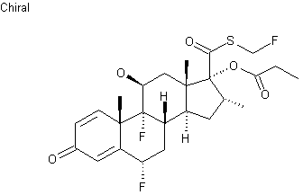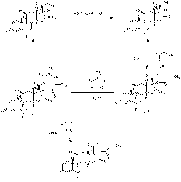 The oxidation of flumethasone (I) with Pd(OAc)2, PPh3 and IO4H in DMA gives the 17-beta-carboxylic acid (II), which is selectively monoacylated with propionyl chloride (III) and Et2NH in acetone, yielding the 17-alpha-propionyloxy derivative (IV). The reaction of (IV) with N,N-dimethylthiocarbamoyl chloride (V), TEA and NaI in 2-butanone affords the thioanhydride (VI), which is finally treated with chlorofluoromethane and SHNa in DMA to provide the desired fluoromethyl thioester.