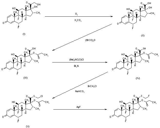 The oxidation of flumethasone (I) with oxygen and K2CO3 in methanol gives 6alpha,9alpha-difluoro-11beta,17alpha-dihydroxy-16alpha-methyl-3-oxoandrosta-1,4-diene-17beta-carboxylic acid (II), which is partially acylated with propionic anhydride in pyridine to afford the corresponding 17alpha-propionyloxy derivative (III) . The reaction of (III) with dimethylthiocarbamoyl chloride and triethylamine in dichloromethane gives the corresponding carbothioic acid (IV), which is esterified with bromochloromethane and sodium bicarbonate in dimethylacetamide yielding the chloromethyl carbothioate ester (V). Finally, this compound is treated with AgF in acetonitrile.