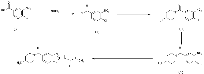 The reaction of 4-chloro-3-nitrobenzoic acid (I) with thionyl chloride gives the acid chloride (II) which, by reaction with 4-methylpiperidine, affords the amide (III). Amination of (III) with methanolic ammonia followed by reduction of the nitro group gives the diamine compound (IV), which reacts with 1,3-bis(methoxycarbonyl)-S-methylisothiourea affording CDRI-87-144.