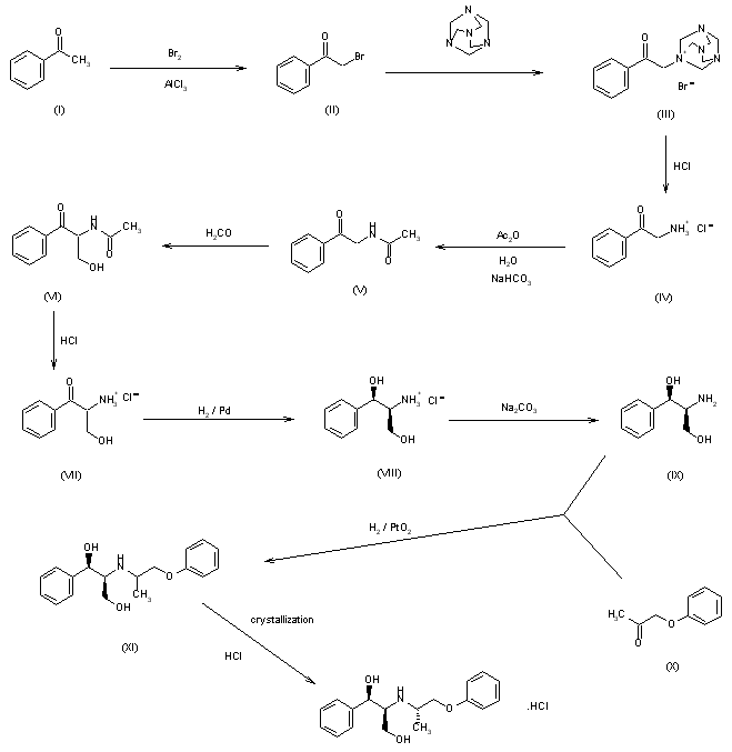 2-Aminoacetophenone.HCl (IV) is prepared from acetophenone (I) via 2-bromoacetophenone (II) and the quaternary urotropine salt (III). Acetylation of (IV) with acetic anhydride in water in the presence of sodium hydrogen carbonate yields 2-acetamidoacetophenone (V), which is converted to 2-acetamido-3-hydroxypropiophenone.HCl (VI) with formaldehyde in water. After removing the acetyl group with hydrochloric acid in ethanol, 2-amino-3-hydroxypropiophenone.HCl (VII) is formed, which is reduced with hydrogen over Pd/C in methanol to rac-erythro-2-amino-1-phenyl-1,3-propanediol.HCl (VIII). Reductive condensation of the corresponding base (IX) with phenoxyacetone (X) and hydrogen over PtO2 affords a mixture of aminodiols epimeric at C-1' (XI). (XI) is finally converted to the corresponding hydrochloride salts, from which the salt of the less soluble [1R*,2S*(S*)]-stereoisomer, i.e., solpecainol is isolated by crystallization. Structure and purity of solpecainol have been confirmed by x-ray crystallography and HPLC-MS.