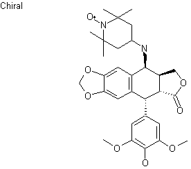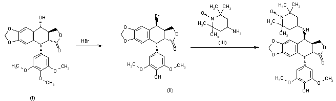 Podophyllotoxin (I), isolated from the roots of Podophyllum emodi Wall var. chinensis sprague by extraction with ethanol and purified through repeated recrystallization from ethanol-benzene, is demethylated and brominated in a single step. (I) is suspended in a cold mixture of ethylene dichloride and ether. Anhydrous hydrogen bromide is passed until the calculated weight increase is reached. After standing at 0-2 C for 20 hours, the solvent is removed under reduced pressure. 4-Bromo-4-deoxy-4'-demethylepipodophyllotoxin (II) is recrystallized from acetone. A solution of (II) and 4-amino-2,2,6,6-tetramethylpiperidin-1-oxyl (III) with a trace of anhydrous pyridine in THF is refluxed under nitrogen atmosphere for 4 hours. The insoluble solid is removed by filtration and the solvent is distilled off under reduced pressure. The crude product is chromatographed twice through silica gel, using methylene chloride-acetone-diethylamine (40:1:1, by volume) as eluent. GP-7 is recrystallized from acetone-hexane.