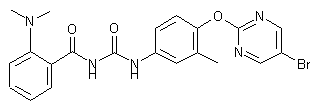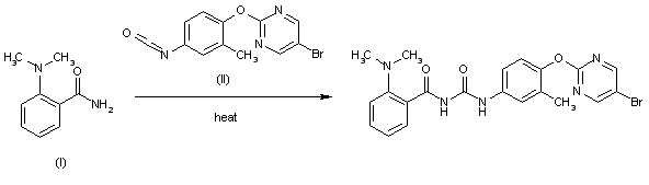The condensation of 2-(dimethylamino)benzamide (I) with 4-(5-bromopyrimidin-2-yloxy)-3-methylphenyl isocyanate (II) in refluxing toluene gives the target urea.