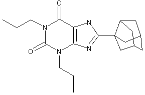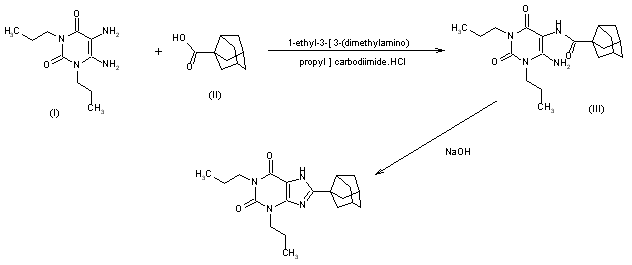 a) A synthetic method is presented: Acylation of 1,3-dipropyl-5,6-diaminouracil (I) with a 3-noradamantane carboxylic acid (II) gave (III). Treatment of (III) with aqueous NaOH afforded the cyclized product KW-3902.