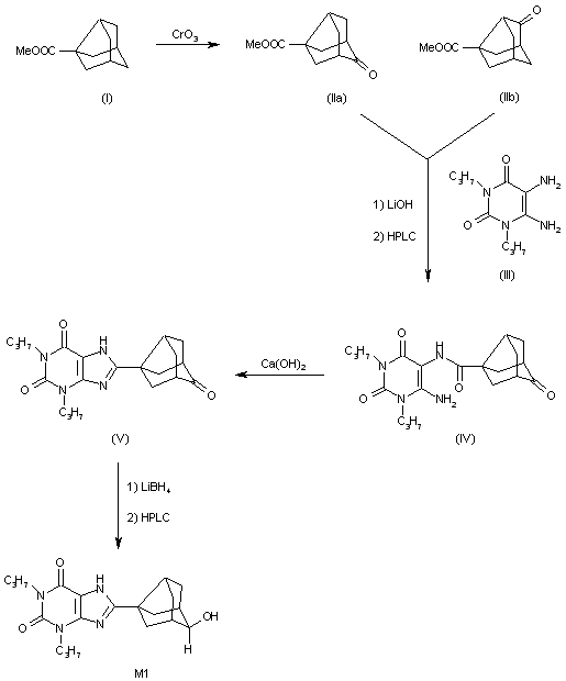 The oxidation of tricyclo[3.3.1.03,7]nonane-3-carboxylic acid methyl ester (I) with CrO3 in acetic anhydride/acetic acid gives a mixture of the 9-oxo and 6-oxo isomers (II), which is condensed with 5,6-diamino-1,3-dipropylpyrimidine-2,4(1H,3H)-dione (III) by means of LiOH, and after HPLC separation yields the 9-oxo isomer (IV) of the condensation product. The cyclization of (IV) by means of Ca(OH)2 affords the 1,3-dipropylxanthine derivative (V), which is finally reduced with LiBH4 to a mixture of isomers that is separated by HPLC yielding finally metabolite M1.