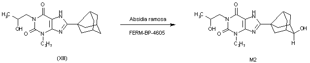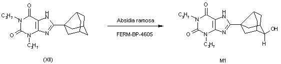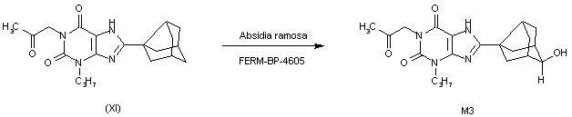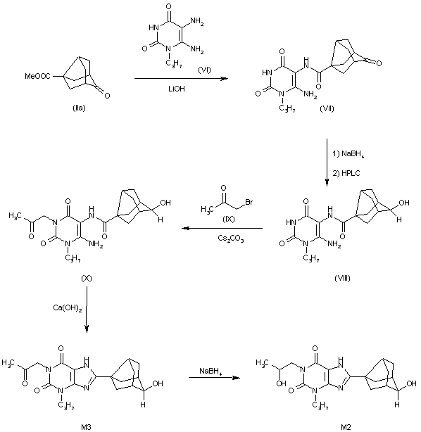 The condensation of 9-oxotricyclo[3.3.1.03,7]nonane-3-carboxylic acid methyl ester (II) with 5,6-diamino-1-propylpyrimidine-2,4(1H,3H)-dione (VI) by means of LiOH gives the expected condensation product (VII), which by reduction with NaBH4 and HPLC separation yields the exo-hydroxy isomer (VIII). The condensation of (VIII) with bromoacetone (IX) by means of cesium carbonate affords compound (X), which is cyclized with Ca(OH)2 as before to give metabolite M3. Finally, this compound is reduced with NaBH4 to afford metabolite M2.