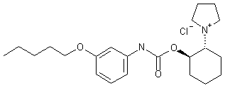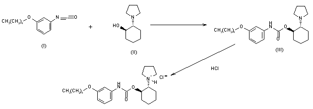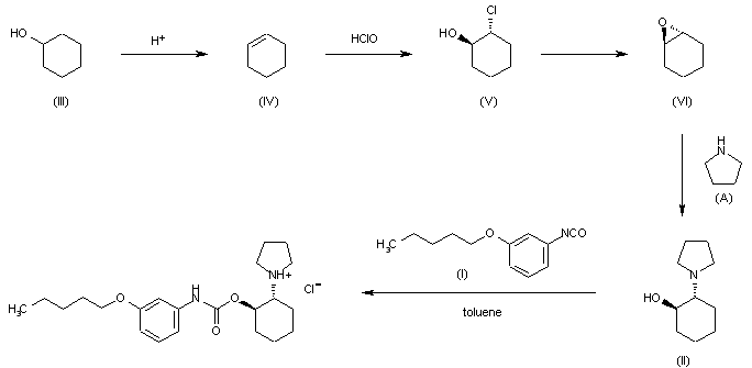By refluxing a solution of equimolecular quantities of 3-pentyloxyphenyl isocyanate (I) and trans-2-(1-pyrrolidinyl)cyclohexanol (II) in toluene. The obtained pentacaine base is transformed to the hydrochloride by treatment of an ether solution of anhydrous hydrogen chloride (1,2). The starting amino-alcohol (II) is prepared from cyclohexanol (III), which is first dehydrated to cyclohexene (IV). The following addition of HClO gives trans-2-chlorocyclohexanol (V), which, in turn is dehydrochlorinated to 1,2-epoxycyclohexane (VI). Final addition of pyrrolidine (A) yields the required intermediate (II).