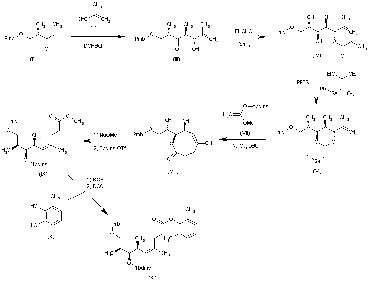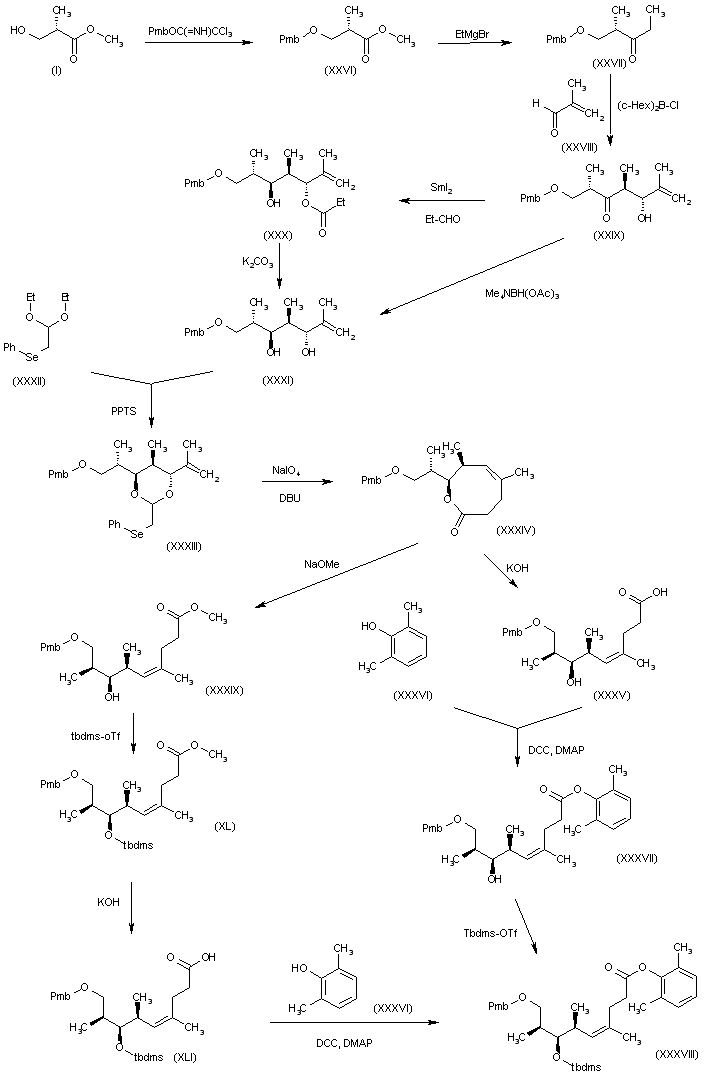 Synthesis of the target (+)-Discodermolide: The reaction of 3-hydroxy-2(S)-methylpropionic acid methyl ester (I) with p-methoxybenzyl trichloroacetimidate gives the benzyl ether (XXVI), which is condensed with ethylmagnesium bromide in THF to yield the chiral ketone (XXVII). The reaction of (XXVII) with 2-methylpropenal (XXVIII) by means of (c-Hex)2B-Cl and TEA in ethyl ether affords the chiral hydroxyketone (XXIX), which is reduced with SmI2 and propanal to provide the beta-diol monoester (XXX). The methanolysis of (XXX) by means of K2CO3 furnishes the diol (XXXI), which can also be obtained directly by reduction of (XXIX) with Me4NBH(OAc)3 in acetonitrile/AcOH. The reaction of (XXXI) with the diethylacetal (XXXII) and PPTS in refluxing toluene gives the phenylselenoacetal (XXXIII), which is oxidized with NaIO4 and treated with DBU to achieve a Claisen rearrangement and yield the eight member lactone (XXXIV). The hydrolysis of (XXXIV) with KOH in refluxing aqueous methanol affords the hydroxyacid (XXXV), which is esterified with 2,6-dimethylphenol (XXXVI) by means of DCC and DMAP in dichloromethane to provide the phenyl ester (XXXVII). The reaction of (XXXVII) with Tbdms-OTf and lutidine gives the silylated ester (XXXVIII). Alternatively, the methanolysis of the lactone (XXXIV) with NaOMe in methanol gives the hydroxyester (XXXIX), which is treated with Tbdms-OTf as before to yield the silylated ester (XL). The hydrolysis of the ester (XL) with KOH in refluxing aqueous methanol affords the silylated hydroxyacid (XLI), which is esterified with 2,6-dimethylphenol (XXXVI) by means of DCC and DMAP to provide the already reported phenyl ester (XXXVIII).