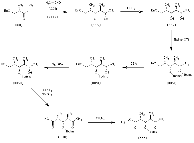 The intermediate (XXX) has been obtained as follows: The condensation of benzylated hydroxypentanone (XXII) with acetaldehyde (XXIII) by means of DCHBCl gives the hydroxyhexanone (XXIV), which is reduced with LiBH4, yielding the diol (XXV). The silylation of (XXV) with Tbdms-OTf affords the disilyl ether (XXVI), which is regioselectively monodesilylated with CSA, providing the alcohol (XXVII). The hydrogenolysis of (XXVII) with H2 over Pd/C gives the primary alcohol (XXVIII), which is treated with (COCl)2 and NaClO2 in order to oxidize the primary alcohol to carboxylic acid and the secondary alcohol to ketone to furnish the ketoacid (XXIX). Finally, this compound is esterified with diazomethane to afford the desired ester intermediate (XXX).