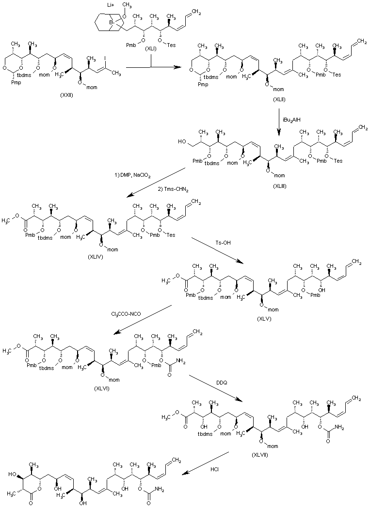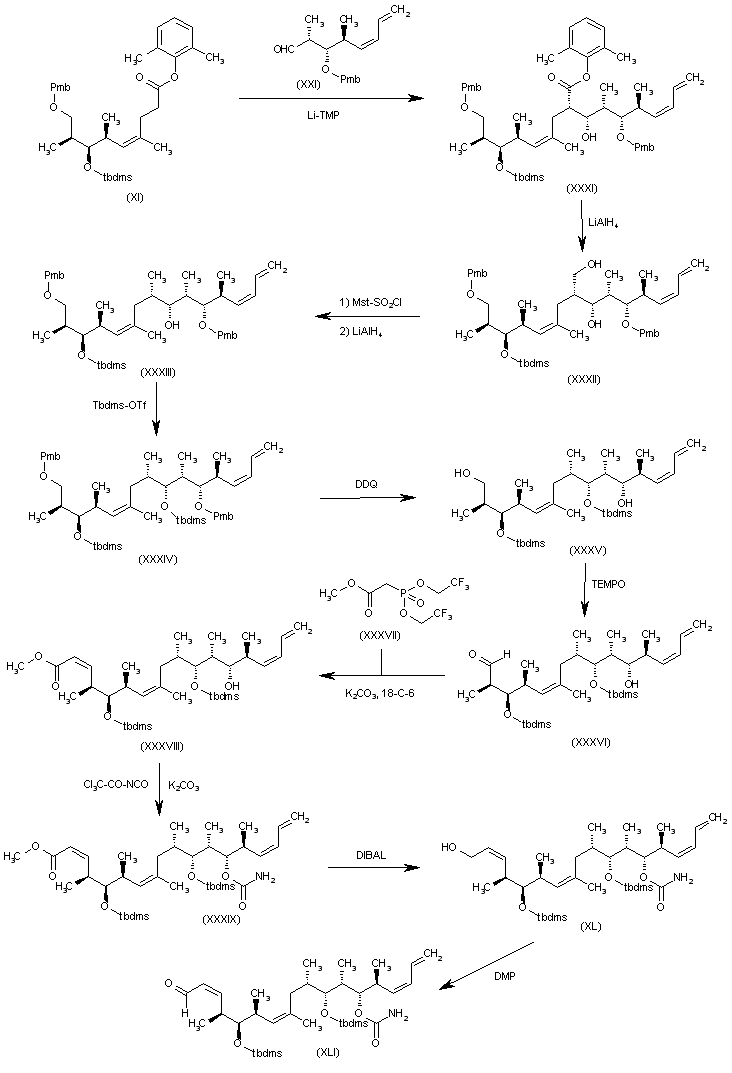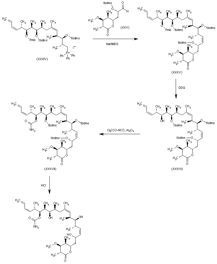 The condensation of (XXXIV) with the intermediate aldehyde (XXV) by means of NaHMDS gives the fully protected lactone derivative (XXXV), which is selectively deprotected at the Pmb group with DDQ, yielding the secondary alcohol (XXXVI). The reaction of (XXXVI) with trichloroacetyl isocyanate and Al2O3 affords the corresponding carbamate (XXXVII), which is finally desilylated with HCl in methanol.