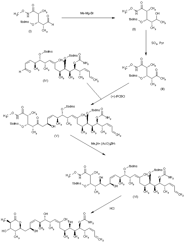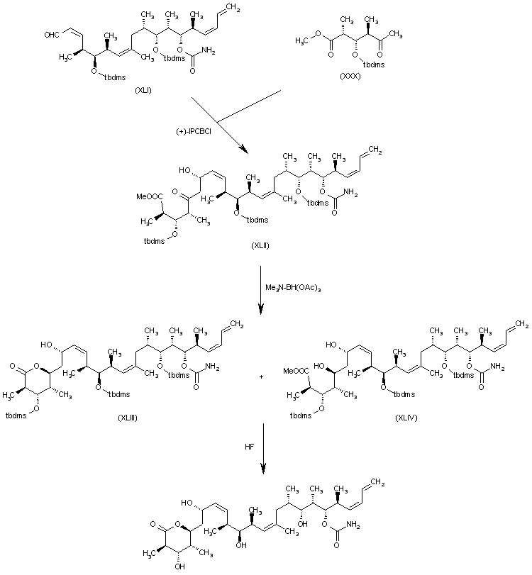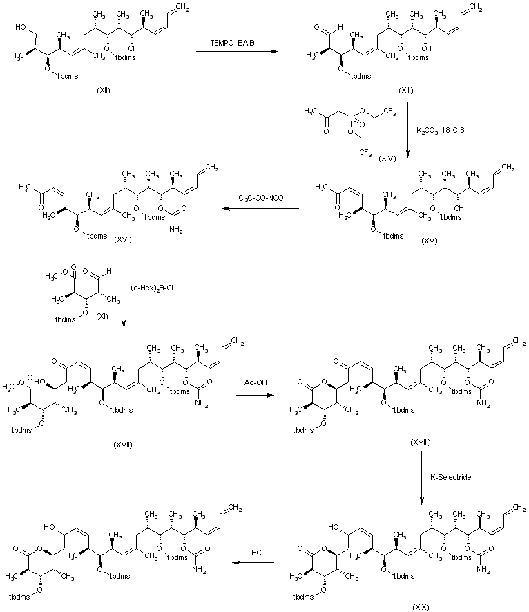 The target compound has been obtained as follows: The condensation of bromo derivative intermediate (XXXIII) with the ketone intermediate (XLIII) by means of LDA gives the adduct (L), which is methylated with methyl iodide and (Tbdps)2N-Li to yield the pentamethyl compound (LI). The desulfuration of (LI) by reaction with HgCl2 followed by oxidation with Jones reagent affords the tetrahydroyranone derivative (LII), which is debenzylated by means of DDQ to furnish the secondary alcohol (LIII). The reaction of (LIII) with trichloroacetyl isocyanate gives the carbamate (LIV), which is reduced with LiAlH(OBu)3I, yielding the secondary alcohol (LV). Finally, this compound is desilylated by treatment with HCl in methanol.