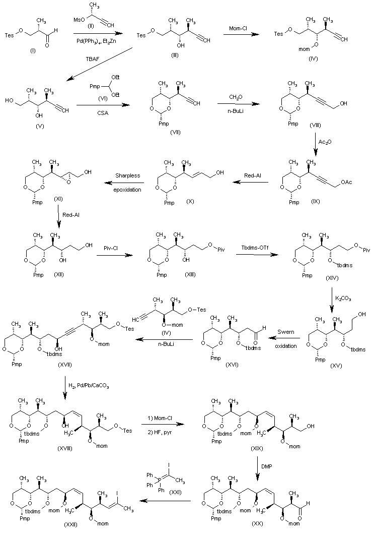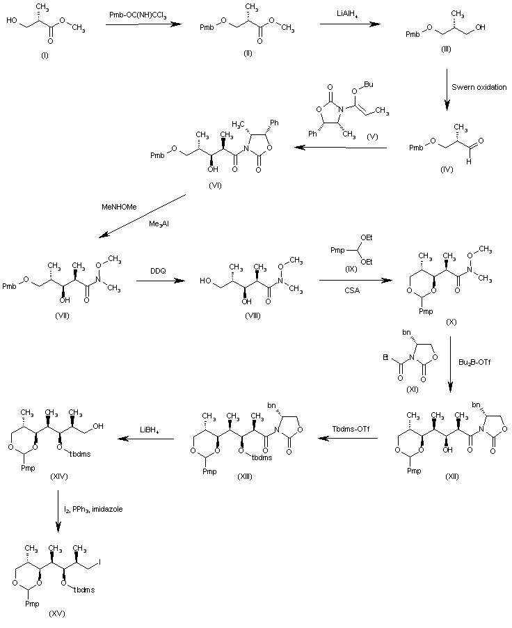 The intermediate (XV) has been obtained as follows: The reaction of methyl 3-hydroxy-2(S)-methylpropionate (I) with 4-methoxybenzyl trichloroacetimidate gives methyl 3-(4-methoxybenzyloxy)-2(S)-methylpropionate (II), which is reduced with LiAlH4, yielding the primary alcohol (III). The Swern oxidation of (III) affords the aldehyde (IV), which is condensed with the chiral imidazolidinone (V) to provide the adduct (VI). The transamidation of (VI) with N,O-dimethylhydroxylamine by means of Me3Al gives the methoxyamide (VII), which is debenzylated with DDQ to yield the diol (VIII). The reaction of (VIII) with 4-methoxybenzaldehyde diethylacetal (IX) and CSA affords the cyclic ketal (X), which is condensed with the propionyloxazolidinone (XI) by means of dibutylboron triflate to furnish the adduct (XII). The silylation of the OH group of (XII) with Tbdms-OTf gives the silyl ether (XIII), which is reduced at the amide group with LiBH4 to yield the primary alcohol (XIV). Finally, this compound is treated with I2 and PPH3 to afford the intermediate iodo derivative (XV).