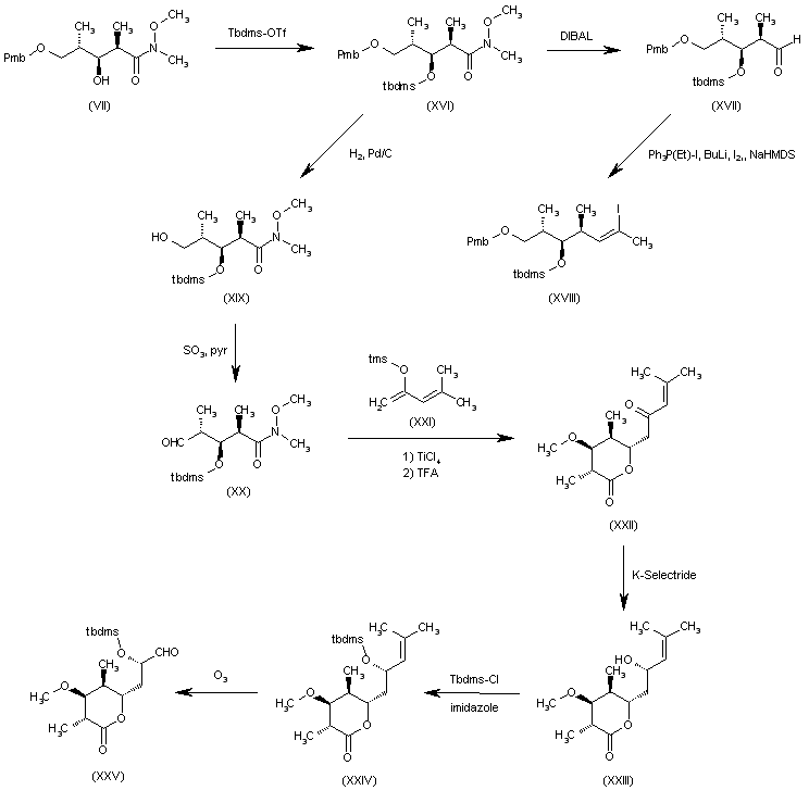 The intermediate (XVIII) has been obtained as follows: The silylation of the intermediate methoxyamide (VII) with Tbdms-OTf gives the silylated methoxyamide (XVI), which is reduced with DIBAL yielding the aldehyde (XVII). Finally, this compound is condensed with ethyltriphenylphosphonium iodide and BuLi and treated with I2 and NaHMDS to afford the intermediate iodo derivative (XVIII). The intermediate (XXV) has been obtained as follows: The hydrogenolysis of intermediate (XVI) with H2 over Pd/C gives the primary alcohol (XIX), which is oxidized with SO3 and pyridine, yielding the aldehyde (XX). The condensation of (XX) with the silylated enol ether (XXI) by means of TiCl4 and TFA affords the lactone (XXII), which is reduced with K-Selectride to provide the chiral alcohol (XXIII). The silylation of (XXIII) with Tbdms-Cl and imidazole gives the silyl ether (XXIV), which is finally ozonolyzed with O3 and PPh3 to yield the target intermediate aldehyde (XXV).