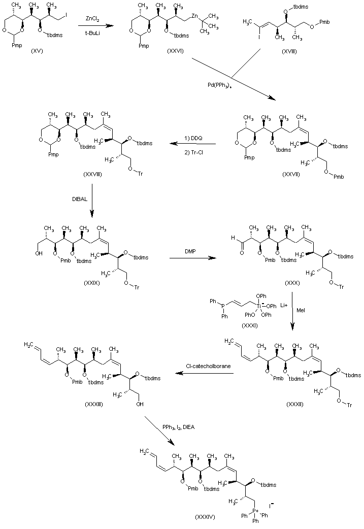 The target compound has been obtained as follows: The reaction of intermediate iodo derivative (XV) with ZnCl2 and BuLi gives the organozinc compound (XXVI), which is condensed with intermediate iodo derivative (XVIII) by means of Pd(PPh3)4, yielding the adduct (XXVII). The selective deprotection of the Pmb group of (XXVII) with DDQ, followed by reprotection with Tr-Cl, affords the suitably protected adduct (XXVIII). Cleaving of the cyclic ketal group of (XXVIII) with DIBAL provides the primary alcohol (XXIX), which is oxidized with DMP, giving the aldehyde (XXX). The condensation of (XXX) with the titanium derivative (XXXI) yields the adduct (XXXII), which is selectively deprotected at the trityl group with chloro-catecholborane to afford the primary alcohol (XXXIII). The reaction of (XXXIII) with PPh3 , I2 and DIEA furnishes the phosphonium iodide (XXXIV).