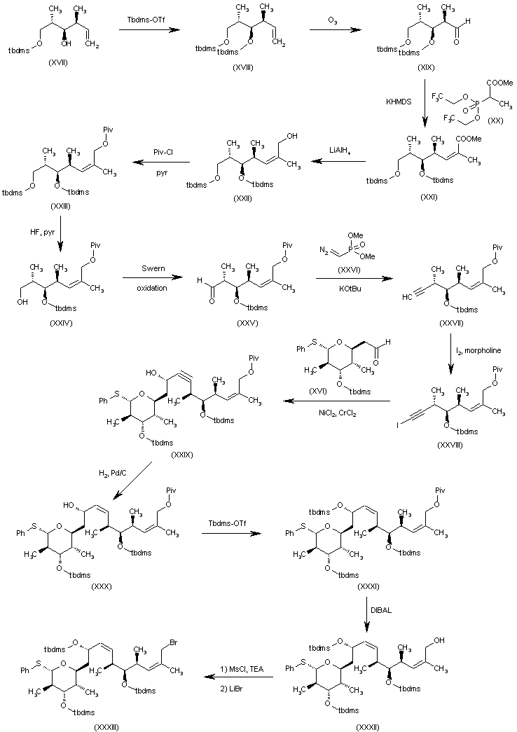 The intermediate (XXXIII) has been obtained as follows: The silylation of the OH group of (2S,3R,4S)-2,4-dimethyl-1-(tert-butyldimethylsilyloxy)-5-hexen-3-ol (XVII) with Tbdms-OTf gives the bis-silyl ether (XVIII), which is ozonolyzed with O3 to yield the aldehyde (XIX). The condensation of (XIX) with the phosphonate (XX) by means of KHMDS affords the methyl heptenoate (XXI), which is reduced with LiAlH4 to the carbinol (XXII). The esterification of (XXII) with pivaloyl chloride and pyridine affords the pivaloyl ester (XXIII), which is selectively desilylated with HF and pyridine to provide the primary alcohol (XXIV). The Swern oxidation of (XXIV) gives the aldehyde (XXV), which is condensed with the phosphonate (XXVI) to yield the terminal acetylene derivative (XXVII). Iodination of (XXVII) with I2 and morpholine affords the iodoacetylene (XXVIII), which is condensed with the already reported acetaldehyde intermediate (XVI) by means of NiCl2/CuCl2 to provide the acetylenic alcohol (XXIX). The reduction of the triple bond of (XXIX) with H2 over Pd/C gives the corresponding allyl alcohol derivative (XXX), which is silylated with Tbdms-OTf to the trisilylated compound (XXXI). Elimination of the pivaloyl protecting group of (XXXI) by means of DIBAL yields the primary alcohol (XXXII), which is treated first with MsCl and TEA and then with LiBr to furnish the target bromoderivative intermediate (XXXIII).