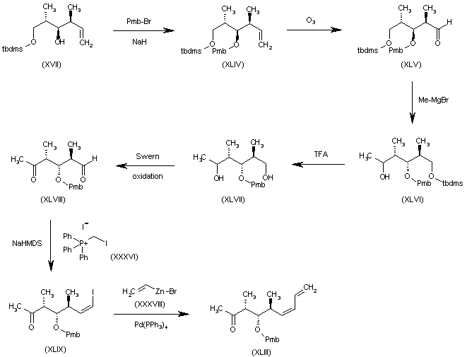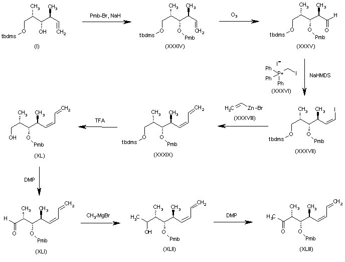The intermediate (XLIII) has been obtained in two related ways: 1) The protection of (2S,3S,4S)-2,4-dimethyl-1-(tert-butyldimethylsilyloxy)-5-hexen-3-ol (I) with p-methoxybenzyl bromide and NaH gives the benzyl ether (XXXIV) which is ozonolyzed with O3, yielding the aldehyde (XXXV), which is condensed with the phosphonium salt (XXXVI) by means of KHMDS to afford the iodovinyl derivative (XXXVII). The homologation of (XXXVII) with vinylzinc bromide (XXXVIII) provides the octadiene derivative (XXXIX), which is desilylated with TFA, furnishing the primary alcohol (XL). The oxidation of (XL) with DMP gives the aldehyde (XLI), which is treated with CH3-MgBr, yielding the secondary alcohol (XLII). Finally, this alcohol is oxidized with DMP to the target intermediate ketone (XLIII). 2) The protection of (2S,3R,4S)-2,4-dimethyl-1-(tert-butyldimethylsilyloxy)-5-hexen-3-ol (XVII) with p-methoxybenzyl bromide and NaH gives the benzyl ether (XLIV), which is ozonolyzed with O3, yielding the aldehyde (XLV). The reaction of (XLV) with CH3-MgBr affords the secondary alcohol (XLVI), which is desilylated with TFA.