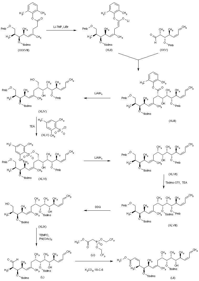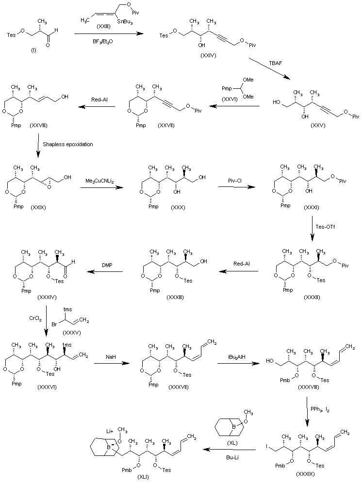 The intermediate (XLI) has been obtained as follows: The condensation of the silylated propionic aldehyde (I) with the chiral allene (XXIII) by means of BF3/Et2O gives the acetylenic alcohol (XXIV), which is desilylated with TBAF, yielding the diol (XXV). The reaction of (XXV) with p-methoxybenzaldehyde dimethyl acetal (XXVI) affords the cyclic ketal (XXVII), which is treated with Red-Al to provided the primary alcohol (XXVIII). The asymmetric Sharpless epoxidation of the double bond of (XXVIII) gives the epoxide (XXIX), which is methylated with Me2CuCNLi2, yielding the chiral diol (XXX). The regioselective acylation of (XXX) with pivaloyl chloride affords the monopivalate (XXXI), which is silylated with Tes-Otf, providing the silyl ether (XXXII). The reductive cleavage of the pivalate ester of (XXXII) with Red-Al furnishes the primary alcohol (XXXIII), which is oxidized with DMP to the aldehyde (XXXIV). The condensation of (XXXIV) with the bromoallyl compound (XXXV) gives the homoallyl alcohol (XXXVI), which is treated with NaH in THF to afford the conjugated diene (XXXVII) (2). The reductive cleavage of the cyclic ketal group of (XXXVII) with iBu2AlH gives the primary alcohol (XXXVIII), which is treated with I2 and PPh3 to yield the iodo derivative (XXXIX). Finally, this compound is condensed with 9-methoxy-9-borabicyclo[3,3,1]nonane (XL) by means of BuLi in THF/ethyl ether to furnish the desired intermediate, the lithium salt (XLI).