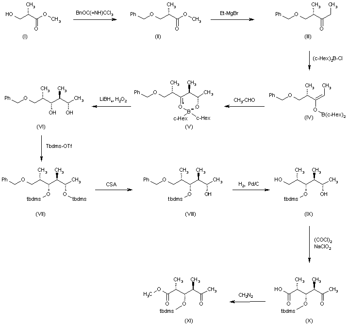 Chiral 5-oxohexanoic ester intermediate (XI): The reaction of 3-hydroxy-2(S)-methylpropionic acid methyl ester (I) with benzyl trichloroacetimidate gives the benzyl ether (II), which is condensed with ethylmagnesium bromide in THF to yield the chiral ketone (III). The reaction of (III) with (c-hexyl)2B-Cl ad TEA affords the boron enolate (IV), which is condensed with acetaldehyde to provide the intermediate boron aldolate (V). The reduction of (V) with LiBH4 and H2O2 in aqueous methanol gives the chiral diol (VI), which is silylated by means of Tbdms-OTf to yield the bis-silyl ether (VII). The selective deprotection of (VII) by means of CSA in methanol/dichloromethane affords the alcohol (VIII), which is debenzylated by means of H2 over Pd/C in ethanol to provide the diol (IX). The oxidation of (IX) with (COCl)2 and DMSO in dichloromethane gives the intermediate oxoaldehyde that is oxidized with NaClO2 to yield the 5-oxohexanoic acid (X). Finally, this compound is methylated with diazomethane in ethyl ether to afford the target, chiral 5-oxohexanoic ester intermediate (XI).