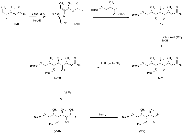 Chiral pentanoic aldehyde intermediate (XIX): The reaction of the chiral benzoate ester (XII) with (c-Hex)2B-Cl and Me2EtN in ethyl ether gives the boron enolate (XIII), which is condensed with the propionaldehyde (XIV) to yield the benzoate ester (XV). The protection of the OH group of (XV) by means of p-methoxybenzyl trichloroacetimidate and Tf-OH affords the corresponding p-methoxybenzyl ether (XVI). The reduction of the ketonic group of (XVI) by means of LiAlH4 in THF or NaBH4 in methanol provides the alcohol (XVII), which is debenzoylated with K2CO3 in methanol to furnish the diol (XVIII). Finally the vicinal diol (XVIII) is oxidized with NaIO4 in aqueous methanol to obtain the target, chiral pentanoic aldehyde intermediate (XIX).