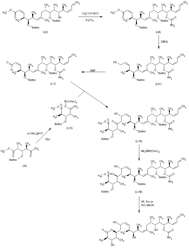 The reaction of the OH group of (LII) with trichloroacetyl isocyanate and K2CO3 in methanol gives the carbamate (LIII). The reduction of the ester group of (LIII) with DIBAL in dichloromethane yields the primary alcohol (LIV), which is oxidized with DMP to afford the aldehyde (LV). The condensation of (LV) with the boron enolate (LVI), (obtained by reaction of the 5-oxohexanoic ester intermediate (XI) with (c-Hex)2B-Cl), provides the chiral 5-oxotetracosatetraenoic ester (LVII), which is reduced with Me4HBH(OAc)3 in acetonitrile/AcOH to give the dihydroxyester (LVIII). Finally, this compound is lactonized and simultaneously deprotected by means of HF/pyridine in THF or HCl in methanol giving rise to the target (+)-Discodermolide.