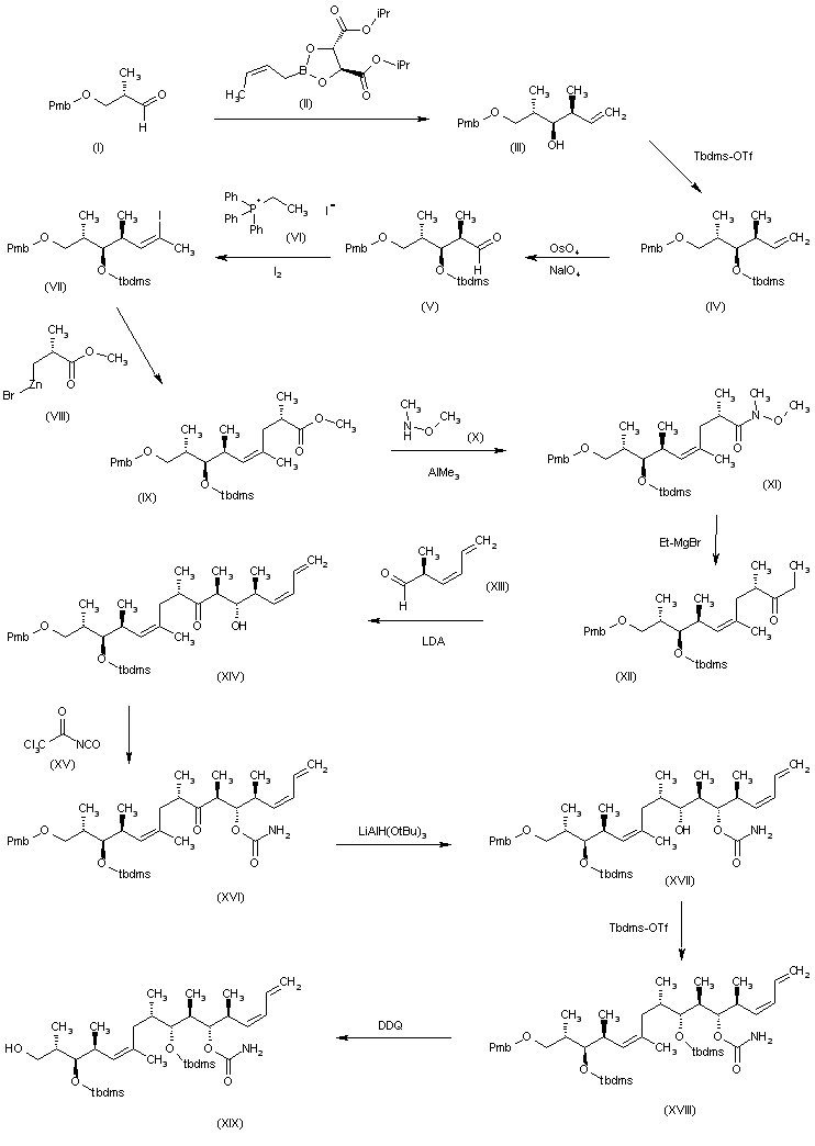 The condensation of the chiral aldehyde (I) with the chiral borane (II) gives the secondary alcohol (III), which is treated with Tbdms-OTf and lutidine to yield the silyl ether (IV). The oxidation of the terminal double bond of (IV) with OsO4 and NaIO4 affords the aldehyde (V), which is condensed with the phosphorane (VI) and iodine to provide the 2-iodoalkene (VII). The condensation of (VII) with the organo zinc derivative (VIII) gives the unsaturated methyl ester (IX), which is treated with N,O-dimethylhydroxylamine (X) to yield the Weinreb amide (XI). The reaction of (XI) with ethylmagnesium bromide affords the ketone (XII), which is condensed with the unsaturated chiral aldehyde (XIII) by means of LDA to provide the unsaturated hydroxyketone (XIV). The reaction of (XIV) with trichloroacetyl isocyanate (XV) gives the carbamate (XVI), whose ketonic group is reduced with LiAlH(OtBu)3 to yield the secondary alcohol (XVII). The reaction of (XVII) with Tbdms-OTf and lutidine affords the silyl ether (XVIII), which is treated with DDQ in dichloromethane to provide the primary alcohol (XIX).