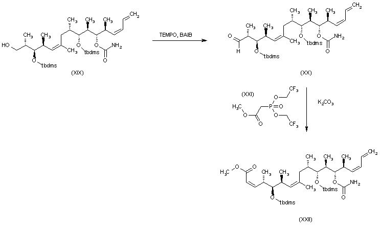 The oxidation of (XIX) with TEMPO and BAIB gives the corresponding aldehyde (XX), which is finally condensed with the phosphonate (XXI) by means of K2CO3 to provide the target intermediate octadecatetraenoic ester (XXII).