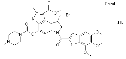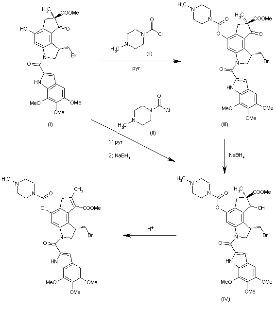The reaction of 8(S)-(bromomethyl)-4-hydroxy-2-methyl-1-oxo-6-(5,6,7-trimethoxyindol-2-ylcarbonyl)-1,2,3,6,7,8-hexahydrobenzo[1,2-b:4,3-b']dipyrrole-2-carboxylic acid methyl ester (I) with tert-butyl-dimethylsilyl chloride in DMF gives the corresponding O-silyl derivative (II), which is treated with camphorsulfonic acid (CPS) in hot chloroform to afford 8(S)-(bromomethyl)-4-hydroxy-2-methyl-6-(5,6,7-trimethoxyindol-2-ylcarbonyl)-3,6,7,8-tetrahydrobenzo[1,2-b:4,3-b']dipyrrole-1-carboxylic acid methyl ester (III). Finally, this compound is desilylated with tetrabutylammonium fluoride in THF and condensed with N-methylpiperazine (IV) and 4-nitrophenyl chloroformate by means of triethylamine in dichloromethane.