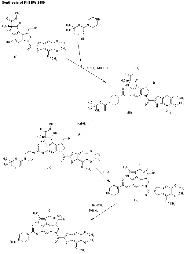 A synthesis of [3H]-KW-2189 has been published: The condensation of duocarmycin B2 (I) with tert-butoxycarbonylpiperazine (II) and 4-nitrophenyl chloroformate by means of triethylamine in dichloromethane gives the expected piperazinecarboxylate (III), which is reduced with NaBH4 in allyl alcohol to yield the hydroxy-derivative (IV). The treatment of (IV) with camphorsulfonic acid (CSA) in hot toluene affords the isomerized compound (V) along with simultaneous deprotection of the piperazine ring. Finally, compound (V) is methylated with tritiated methyl iodide and NaHCO3 in acetone/methanol.