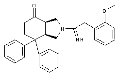 The cyclization of 4,4-diphenyl-2-cyclohexen-1-one (I) with N-benzyl-N-(butoxymethyl)-N-(trimethylsilylmethyl)amine (II) gives 2-benzyl-7,7-diphenylperhydroisoindol-4-one (III), which is debenzylated by hydrogenation with H2 over Pd/C to afford 7,7-diphenylperhydroisoindol-4-one (IV). The optical resolution of (IV) yields the desired enantiomer, which is finally condensed with 2-(2-methoxyphenyl)acetimidic acid ethyl ester tetrafluoroborate (V).
