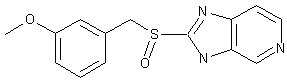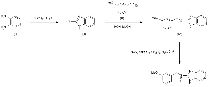 Reaction of 3,4-diaminopyridine (I) with potassium O-ethyl dithiocarbonate produced 2-mercaptoimidazo[4,5-c]pyridine (II), which was susequently alkylated with 3-methoxybenzyl bromide (III) and KOH, yielding sulfide (IV). Selective oxidation of (IV) to the target sulfoxide was then achieved by treatment with N-chlorosuccinimide in the presence of NaHCO3 at 0 C.