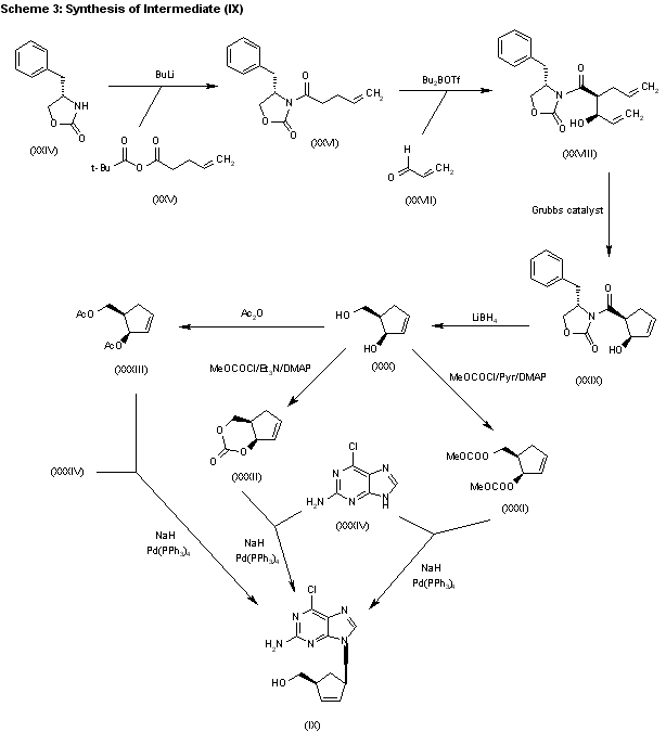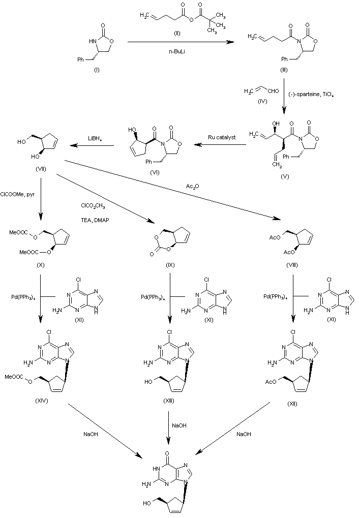 4) The acylation of 4(S)-benzyloxazolidin-2-one (XXIV) with 4-pentenoyl pivaloyl anhydride (XXV) by means of NaH in THF gives 4(S)-benzyl-3-(4-pentenoyl)oxazolidin-2-one (XXVI), which is submitted to a diastereoselective syn aldol condensation with acrolein (XXVII), using dibutylboron triflate as catalyst, affording the aldol (XXVIII). The cyclization of (XXVIII) by means of the Grubbs catalyst in dichloromethane yields the cyclopentenol (XXIX), which is reduced with LiBH4 in THF/methanol to give the key intermediate 5(R)-(hydroxymethyl)-2-cyclopenten-1(R)-ol (XXX). The reaction of (XXX) with methyl chloroformate/pyridine/DMAP or methyl chloroformate/triethylamine/DMAP or acetic anhydride gives the diols (XXXI), (XXXII) and (XXXIII), respectively, each of which coupled with 2-amino-6-chloropurine (XXXIV) in the presence of NaH and palladium tetrakis(triphenylphosphine) in THF/DMSO, affords the purine intermediate (IX) already reported.
