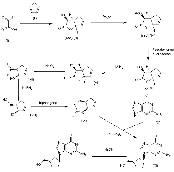 The cyclization of glyoxylic acid (I) with cyclopentadiene (II) gives the racemic hydroxylactone (III), which is acylated with Ac2O to yield acetoxy compound (rac)-(IV). The enzymatic optical resolution of (rac)-(IV) by means of Pseudomonas fluorescens affords the chiral hydroxylactone (-)-(V), which is reduced with LiAlH4 in refluxing THF to provide the lactol (VI). The oxidation of (VI) with NaIO4 in ethyl ether/water gives the chiral carbaldehyde (VII), which is reduced with NaBH4 in ethanol to afford the diol (VIII). The reaction of (VIII) with triphosgene by means of TEA in dichloromethane affords the cyclic carbonate (IX), which is condensed with chloropurine (X) by means of Pd(PPh3)4 in DMSO/THF to provide the adduct (XI). Finally, this compound is hydrolyzed with NaOH to afford the target (-)-carbovir.