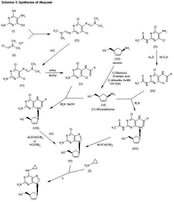 1) The reaction of 4,6-dihydroxypyrimidine-2,5-diamine (I) with (chloromethylene)dimethylammonium chloride (II) in refluxing chloroform gives 4,6-dichloro-2,5-bis(dimethylaminomethyleneamino)pyrimidine (III), which by reaction with aqueous HCl in hot ethanol yields monoamine (IV). The reaction of (IV) with a refluxing phosphate buffer (pH 3.2) affords N-(2-amino-4,6-dichloropyrimidin-5-yl)formamide (V). The condensation of (V) with (1S,4R)-4-amino-2-cyclopentene-1-methanol (VI) (which was obtained by optical resolution of the cis-racemate (VII) with D-dibenzoyltartaric acid, and elimination of the acid with ion exchange resin Amberlite IA-400, by means of triethylamine and NaOH in refluxing ethanol) gives N-[2-amino-4-chloro-6-[4(S)-(hydroxymethyl)-2-cyclopenten-1(R)-ylamino]pyrimidin-5-yl]formamide (VIII). The cyclization of (VIII) with refluxing diethoxymethyl acetate or triethyl orthoformate yields the corresponding purine derivative (IX), which is finally treated with cyclopropylamine (X) in refluxing n-butanol. 2) The formylation of N-(5-amino-4,6-dichloropyrimidin-2-yl)acetamide (XI) with 95% formic acid in acetic anhydride gives the expected formamide (XII), which is condensed with (1S,4R)-4-amino-2-cyclopentene-1-methanol (VI) by means of triethylamine in hot ethanol to yield the substituted pyrimidine (XIII). Finally, the cyclization of (XIII) with diethoxymethyl acetate as before affords the purine intermediate (IX).