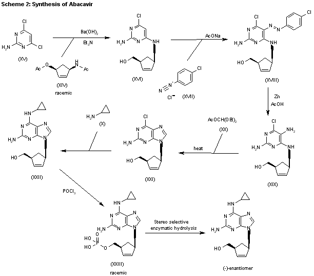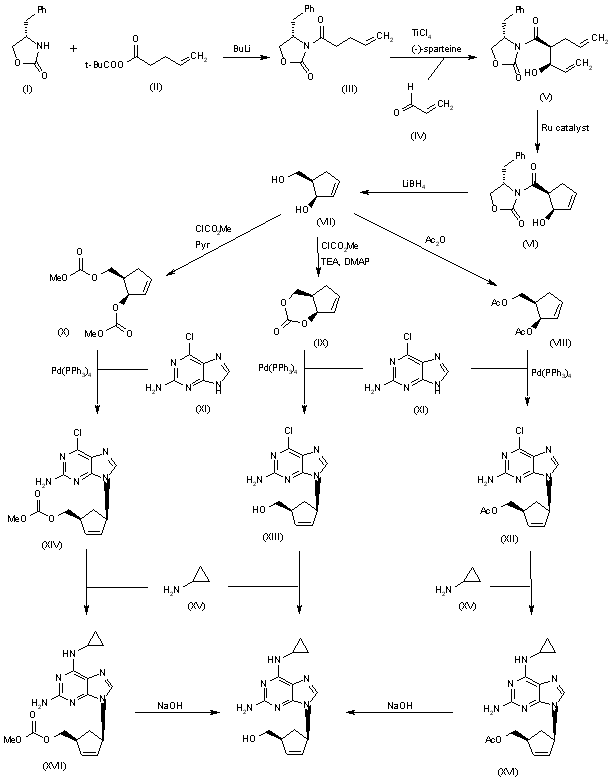 An efficient asymmetric synthesis of abacavir has been reported: Acylation of the chiral oxazolidinone (I) with the mixed anhydride (II) by means of BuLi in THF gives the N-pentenoyloxazolidinone (III), which by condensation with acrolein (IV) catalyzed by TiCl4 and (?-spartein in dichloromethane yields the chiral adduct (V). The ring-closing metathesis of adduct (V) by means of the ruthenium catalyst (Cy3P)Cl2Ru=CHPh in dichloromethane affords the chiral cyclopentenol (VI), which is reduced to 5(R)-(hydroxymethyl)-2-cyclopenten-1(R)-ol (VII) by means of LiBH4 in THF. Reaction of diol (VII) with a) Ac2O, TEA and DMAP, b) methyl chloroformate, TEA and DMAP or c) methyl chloroformate, pyridine and DMAP gives a) the diacetate (VIII), b) the cyclic carbonate (IX) or c) the dicarbonate (X), respectively. The condensation of diacetate (VIII), cyclic carbonate (IX) or dicarbonate (X) with 2-amino-6-chloropurine (XI) by means of Pd(PPh3)4 yields the carbocyclic purines (XII), (XIII) or (XIV), respectively. Treatment of these chloro-purines (XII), (XIII) and (XIV) with cyclopropylamine (XV) in hot DMSO provides the corresponding cyclopropylaminopurine carbonate (XVI), abacavir or cyclopropylaminopurine acetate (XVII), respectively. Finally, the protecting groups of purines (XVI) and (XVII) are hydrolyzed with aqueous NaOH.