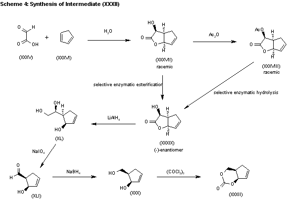 5) The water promoted condensation of glyoxylic acid (XXXV) with cyclopentadiene (XXXVI) gives the racemic cis-hydroxylactone (XXXVII), which is acetylated with acetic anhydride to the acetate (XXXVIII). The selective enzymatic hydrolysis of (XXXVIII) with Pseudomonas fluorescens lipase yields the pre (-)-enantiomer (XXXIX), which is reduced with LiAlH4 in refluxing THF, affording triol (XL). The oxidation of the vicinal glycol of (XL) with NaIO4 in ethyl ether/water yields the hydroxyaldehyde (XLI), which is reduced with NaBH4 in ethanol to give the key intermediate 5(R)-(hydroxymethyl)-2-cyclopenten-1(R)-ol (XXX). This compound, by reaction with triphosgene and triethylamine in dichloromethane, results in the cyclic carbonate intermediate (XXXII), already reported.