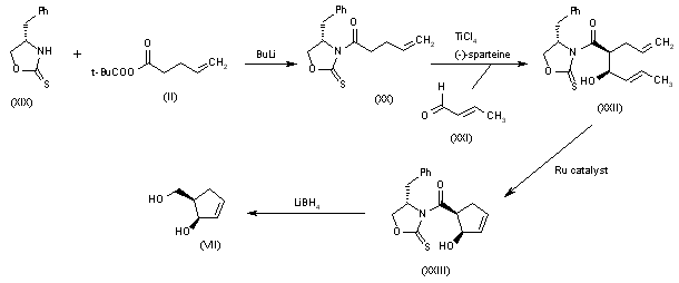 Alternatively, 5(R)-(hydroxymethyl)-2-cyclopenten-1(R)-ol (VII) can also be obtained as follows: Acylation of the chiral oxazolidinethione (XIX) with the mixed anhydride (II) by means of BuLi in THF gives the N-pentenoyl-oxazolidinethione (XX), which by condensation with crotonaldehyde (XXI) catalyzed by TiCl4 and (?-spartein in dichloromethane yields the chiral adduct (XXII). The ring-closing metathesis of (XXII) by means of the ruthenium catalyst in dichloromethane affords the chiral cyclopentenol derivative (XXIII), which is reduced to the target diol (VII) by means of LiBH4 in THF.