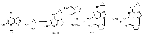 Alternatively, 2-amino-6-chloropurine (XI) is treated with cyclopropylamine (XV) in hot DMSO to give 2-amino-6-(cyclopropylamino)purine (XVIII), which is condensed with the chiral diacetate (VIII) by means of Pd(PPh3)4 to yield the carbocyclic purine acetate (XVI). Finally, purine (XVI) is deprotected by hydrolysis with aqueous NaOH.