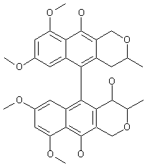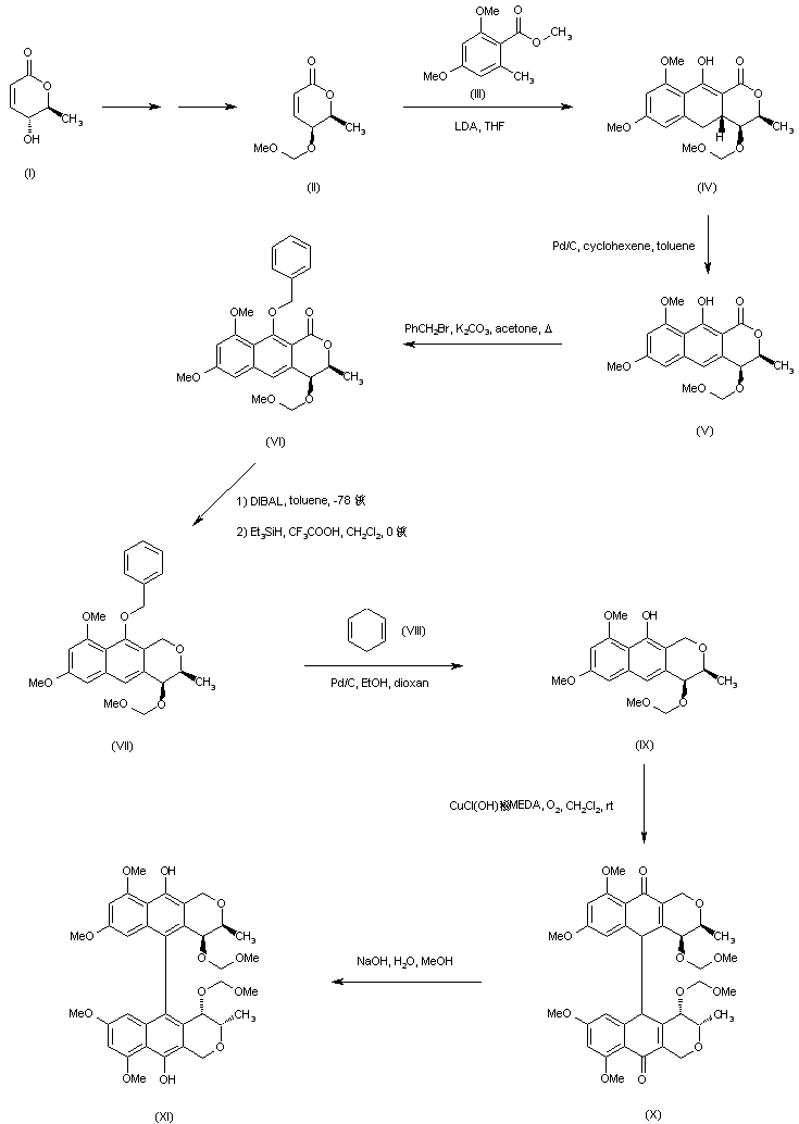 The title compound was originally isolated from the culture broths of Verticillum sp. The synthesis of this compound has been further described. The unsaturated lactone (I) was isomerized at the C-4 hydroxyl group, and subsequently protected as the methoxymethyl ether (II). Condensation of (II) with benzoate ester (III) in a tandem Michael addition-Dieckmann cyclization reaction afforded the tricyclic compound (IV), which was aromatized to the naphthopyranone (V) by treatment with cyclohexene and Pd/C. Protection of the hydroxyl group of (V) with benzyl bromide and K2CO3 gave benzyl ether (VI). After reduction of the lactone function of (VI) to the corresponding lactol by means of DIBAL, further deoxygenation with triethylsilane and trifluoroacetic acid provided the cyclic ether (VII). The benzyl group of (VII) was removed by hydrogenolysis with cyclohexadiene (VIII) and Pd/C, and the resulting hydroxynaphthopyran (IX) was oxidatively dimerized, affording (X) as a diasteromeric mixture. Aromatization of (X) by NaOH produced the bisnaphthol (XI).