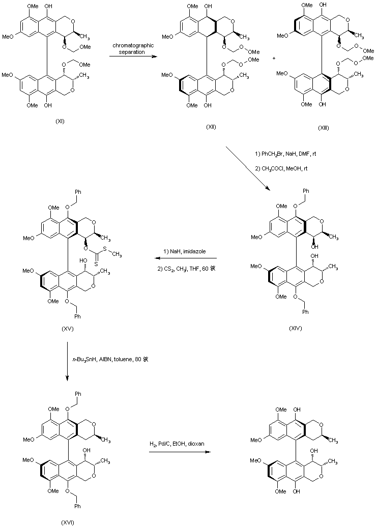 Bisnaphthol (XI) was chromatographically separated into atropisomers (XII) and (XIII). The required isomer (XII) was benzylated with NaH and benzyl bromide, and the methoxymethyl group was removed by treatment with HCl, generated from acetyl chloride in MeOH, to furnish diol (XIV). Reduction of one hydroxyl group of (XIV) was then effected by the sequence of conversion to the S-methyl dithiocarbonate (XV), followed by radical deoxygenation with n-Bu3SnH and AIBN to yield (XVI). The O-benzyl groups of (XVI) were finally removed by hydrogenation over Pd/C.