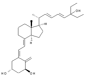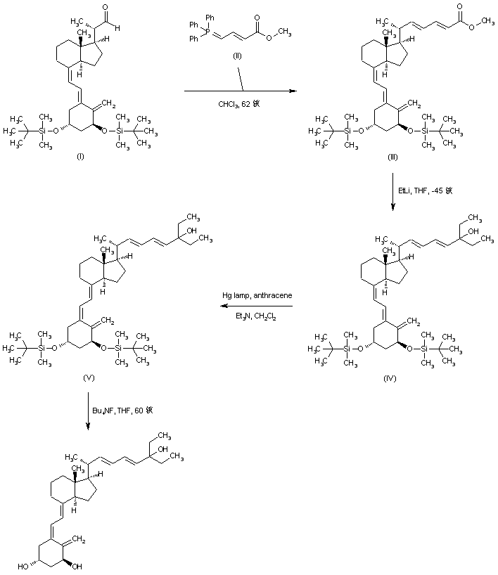 Wittig reaction of the vitamin D-derived aldehyde (I) with 3-(methoxycarbonyl)-2-propenyl-1-idene triphenylphosphorane (II) produced the dienoate ester (III). Subsequent addition of ethyllithium to the ester group of (III) furnished the tertiary alcohol (IV). Photochemical isomerization of the 5-6 double bond of (IV) gave rise to the (5Z)-isomer (V), which was finally desilylated using tetrabutylammonium fluoride in THF.