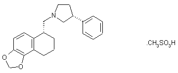 This compound has been obtained by several different ways: 1) The reaction of 6,7,8,9-tetrahydronaphtho[1,2-d][1,3]dioxol-6-one (I) with trimethylsilyl cyanide gives 8,9-dihydronaphtho[1,2-d][1,3]dioxole-6-carbonitrile (II), which is hydrogenated with NaBH4 and hydrolyzed with KOH yielding the carboxylic acid (III). The condensation of (III) with 3-phenylpyrrolidine (IV) by means of DCC in THF affords the acylated pyrrolidine (V), which is reduced with BH3 in THF giving intermediate (VI) as a mixture of the cis and trans racemic diastereomers. Finally, the reaction of this mixture with methanesulfonic acid yields the corresponding mixture of mesylates that is separated by crystallization to afford the target cis racemate. 2) The reduction of carbonitrile (II) with H2 over Raney-Ni gives the corresponding amine (VII), which is cyclized with 2-phenylsuccinic anhydride (VIII) to yield the succinamic acid derivative (IX). The cyclization of (IX) by means of acetyl chloride affords the succinimide (X) as a mixture of the cis and trans racemic diastereomers, which are separated by crystallization giving the cis racemate (cis)(X). Finally, this racemate is reduced with BH3.THF or BH3. Dimethyl sulfide and treated with methanesulfonic acid to afford the target compound. 3) The cyclization of amine (VII) with the dimesylate (XI) by means of DIEA in ethanol gives also the previously described mixture of the cis and trans racemic diastereomers (VI).