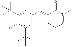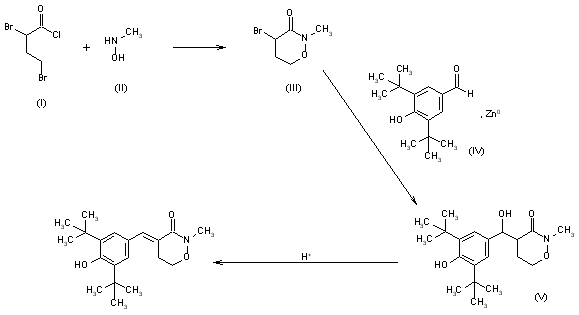 The 2,4-dibromobutyrylchloride (I) was reacted with N-methylhydroxylamine (II) in methylene chloride with NaOH to yield 4-bromo-2-methyl-5,6-dihydro-2H-1,2-oxazin-3(4H)-one (III). The reaction of (III) and zinc with 3,5-di-tert-butyl-4-hydroxybenzaldehyde (IV) underwent Reformatsky-type reaction. Dehydration of the hydroxymethyl intermediate (V) in refluxing toluene with p-toluenesulfonic acid afforded BF-389.