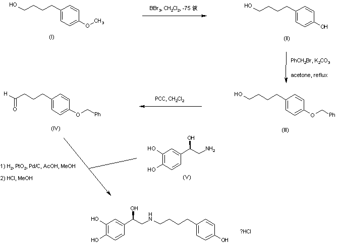 Demethylation of 4-(4-methoxyphenyl)butanol (I) by means of BBr3 gave phenol (II), which was subsequently protected as the benzyl ether (III) with benzyl bromide and K2CO3. Oxidation of the primary alcohol (III) employing pyridinium chlorochromate yielded aldehyde (IV). Finally, reductive amination of aldehyde (IV) with norepinephrine (V), with concomitant O-debenzylation, was accomplished by hydrogenation in the presence of both PtO2 and Pd/C.