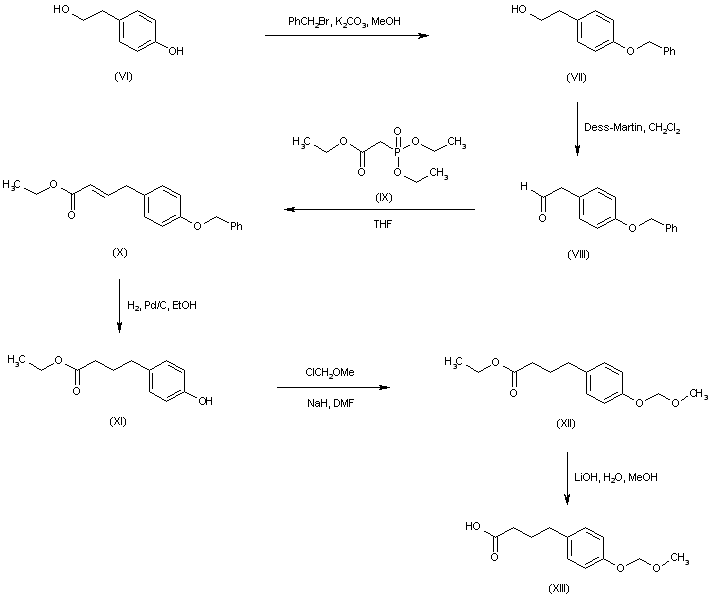 The intermediate carboxylic acid (XIII) was prepared as follows: 2-(4-Hydroxyphenyl)ethanol (VI) was selectively protected at the phenolic hydroxyl with benzyl bromide, yielding (VII). Subsequent oxidation of the aliphatic alcohol group of (VII) with Dess-Martin periodinane reagent provided aldehyde (VIII). Wadsworth-Emmons condensation of (VIII) with the sodium derivative of phosphonate (IX) furnished adduct (X), which was further hydrogenated over Pd/C to the saturated ester (XI). The phenolic hydroxyl group of (XI), which was concomitantly debenzylated in the preceding hydrogenation step, was further reprotected as the methoxymethyl ether (XII). Acid (XIII) was then obtained by basic hydrolysis of ester (XII).