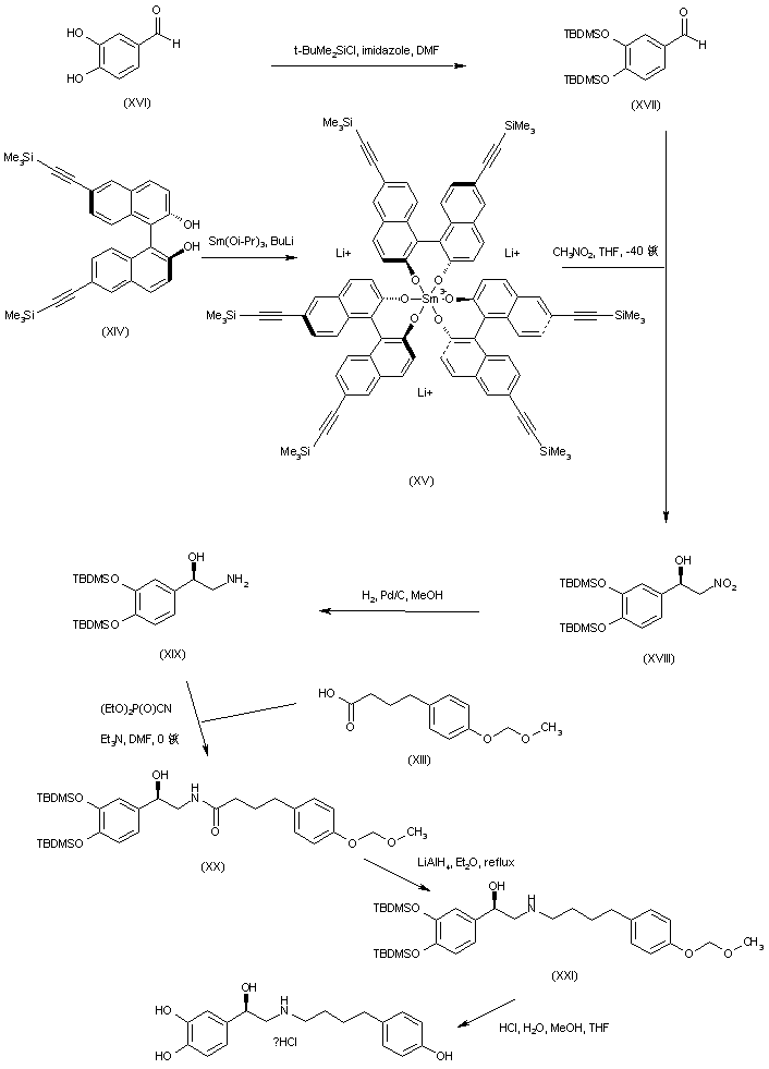 Protection of 3,4-dihydroxybenzaldehyde (XVI) with t-butyldimethylsilyl chloride and imidazole provided the corresponding bis-silyl ether (XVII) (2). Asymmetric nitroaldol condensation of aldehyde (XVII) with nitromethane in the presence of the chiral samarium tris(binaphthoxide) complex (XV) --prepared from (S)-6,6'-bis(trimethylsilylethynyl)-1,1'-dihydroxy-2,2'-binaphthalene (XIV) and samarium triisopropoxide in the presence of BuLi (2,3)-- gave rise to the (R)-nitro alcohol adduct (XVIII) with high optical purity. Catalytic hydrogenation of the nitro group of (XVIII) furnished the silylated norepinephrine (XIX), which was coupled with acid (XIII) in the presence of diethylphosphoryl cyanide to yield amide (XX). Reduction of amide (XX) with LiAlH4 gave amine (XXI). The silyl and methoxymethyl protecting groups were finally removed under acidic conditions to furnish the title compound.