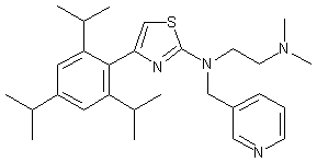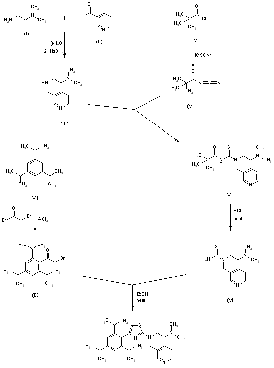 SR 27417 (N-(2-dimethylaminoethyl)-N-(3-pyridinylmethyl)[4-(2,4,6-triisopropylphenyl)thiazol-2-yl]amine difumarate) was prepared via a convergent route. Reductive amination of N,N-dimethylaminoethanamine (I) and pyridyl-3-carboxaldehyde (II) by sodium borohydride gave the amine (III). Eaction of pivaloyl chloride (IV) and potassium thiocyanate in anhydrous acetone provided the pivaloyl isothiocyanate (V), which was condensed in situ with the amine (III) to afford the protected thiourea (VI). Chlorhydric hydrolysis of (IV) gave the thiourea (VII) with the bromoketene (IX) in refluxing ethanol led to SR 27417.