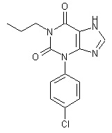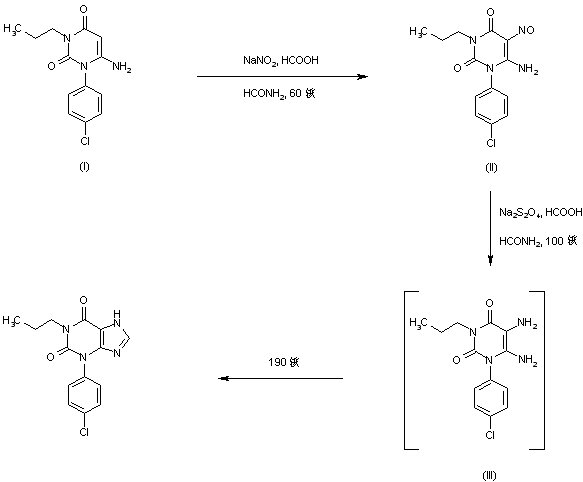 Nitrosation of 1-(4-chlorophenyl)-3-propyl-6-aminouracil (I) by means of sodium nitrite and formic acid in hot formamide afforded the 5-nitroso derivative (II). This was reduced with sodium dithionite at 100 C to produce the intermediate diamino uracil (III) which, on further heating at 190 C in formamide, gave rise to the title xanthine.
