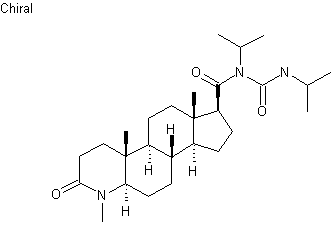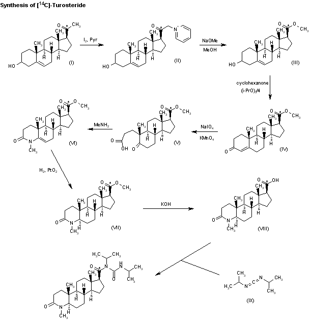 The synthesis of [14C]-turosteride has been reported: The reaction of 20-[14C]-3-hydroxy-5-pregnen-20-one (I) with iodine and pyridine gives the pyridinium derivative (II), which is treated with sodium methoxide and methanol yielding 3-hydroxy-5-androstene-17beta-carboxylic acid methyl ester (III). The oxidation of (III) with cyclohexanone and aluminum isopropoxide affords 3-oxo-5-androstene-17beta-carboxylic acid methyl ester (IV), which is oxidized with potassium permanganate and sodium periodate to the propionic acid derivative (V). The cyclization of (V) with methylamine in diglyme at 180 C affords 4-methyl-3-oxo-4-aza-5-androstene-17beta-carboxylic acid methyl ester (VI), which is hydrogenated with H2 over PtO2 in acetic acid to the corresponding saturated compound (VII). The saponification of (VII) with KOH in refluxing methanol/water gives the 4-methyl-3-oxo-4-aza-5alpha-androstane-17beta-carboxylic acid (VIII), which is finally condensed with diisopropylcarbodiimide (IX) in refluxing dichloromethane.