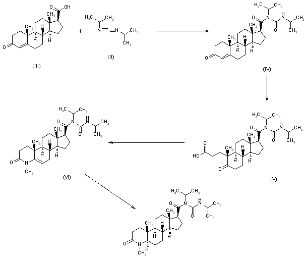 2) By the reaction of 3-oxoandrost-4-ene-17beta-carboxylic acid (III) with diisopropylcarbodiimide (II) in refluxing ethyl acetate and subsequent A-ring opening of compound (IV) by treatment with the Lamieux-von Rudloff reagent (permanganate-periodate) in isopropanol. The cyclization of the secoacid (V) so obtained, with methylamine in dioxane under pressure, followed by the hydrogenation under pressure, on 10% Pd/C in ethanol, affords turosteride. This method is used for the large scale production of turosteride.